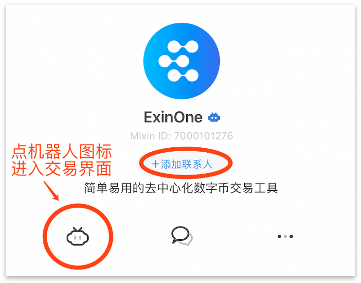 Mixin 上最好用的交易所、余额宝及定投神器三合一的服务 ExinOne 就已经在那儿等你了,你必须拥有。在 Mixin 中所有的服务都被称作机器人,所以你现在只需要在 Mixin Messenger 中搜索 ExinOne(ID:7000101276) 将其添加为联系人即可。